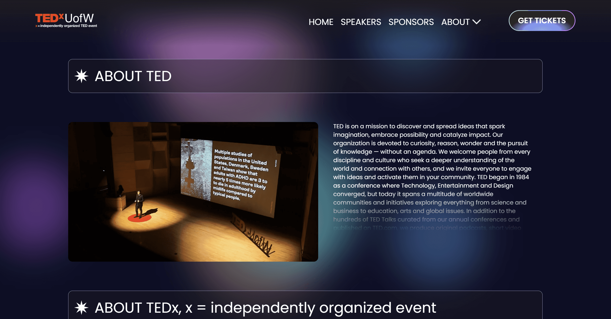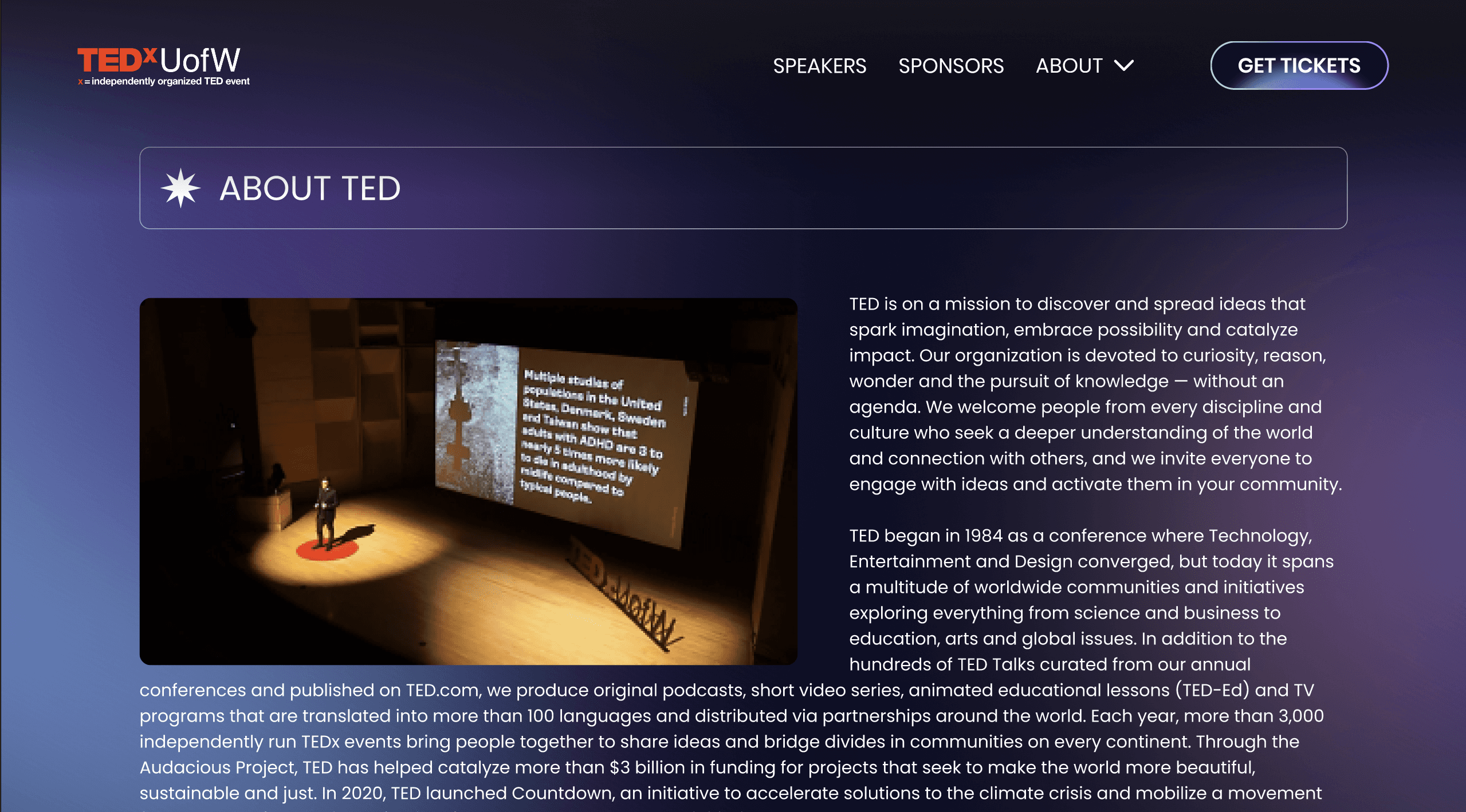 Since transitioning to a virtual format in 2020, TEDxUofW’s annual conference attendance fell to an all-time low. Even after returning in person in 2022, many students remained unaware of the organization’s presence on campus, contributing to low turnout. How might we improve the conference website to increase visibility and drive attendance?